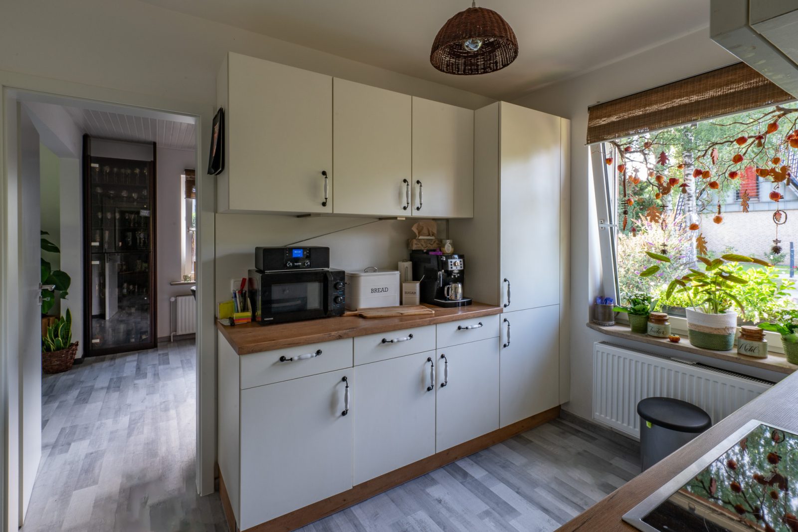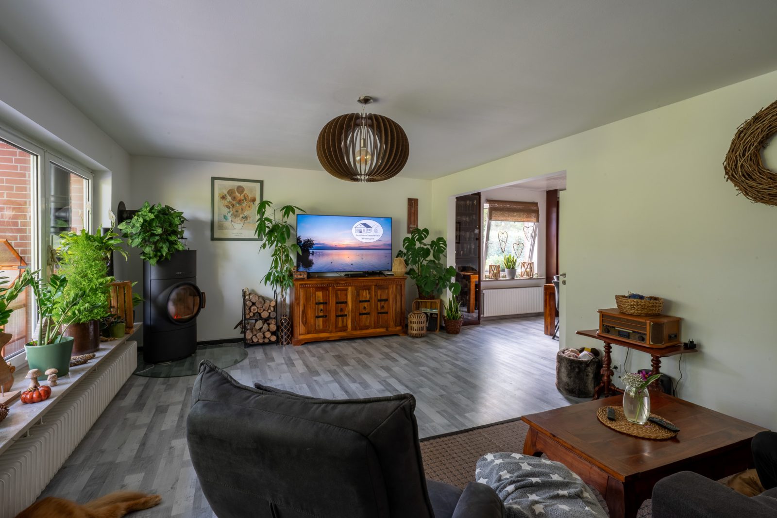 - Bodenbeläge: Laminat in Wohnräumen, Fliesen in Küche und Badezimmern